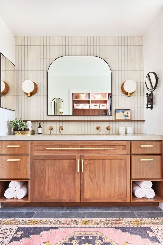 A midcentury modern primary bathroom boasts a captivating fusion of design elements that transcend time. The palette is a harmonious blend of raw wood, shimmering gold accents, and warm cream hues. The raw wood, showcased in sleek, minimalist vanities and mirrored cabinets, evokes a natural, grounding aesthetic, while the delicate gilded fixtures add a touch of luxury and refinement. Warm creams envelop the walls and tiles, casting a soft and inviting glow, and the overall design exudes a sense of understated elegance. This midcentury modern bathroom marries the simplicity of midcentury design with the opulence of gold and the comforting embrace of warm creams, creating a space where timeless beauty and modern comfort seamlessly coexist.